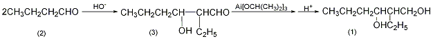 2-乙基-3-羥基己醛(3):于裝有攪拌器、溫度計、滴液漏斗的反應瓶中,加入正己醛(3)260g(3.6mol0),150ml,冰鹽浴冷卻至-3℃,開始滴加30ml(10%)的醛氧化鉀溶液,開始時滴加要緩慢,以防溫度超過8℃。約3h加完。加完后再攪拌反應5h。分出有機層,水洗三次,無水鈉干燥。回收,減壓蒸出低沸物,得粗產品2-乙基-3-羥基己醛(3)200~220g。2-乙基-1,3-己二醇(1):于裝有攪拌器、回流冷凝器的反應瓶中,加入鋁屑33g(1.2mol),無水異丙醇300ml,加入碘0.1g,水浴加熱,生成異丙醇鋁,并有大量氫氣放出,當大部分的鋁參加反應后,再加入無水異丙醇300ml。回流6h以使反應完全。反應體系呈深灰色。冷后加入前面制得的2-乙基-3-羥基己醛(3),安上有填充物的分餾柱,不斷蒸出生成的丙酮。隨著反應的的進行,丙酮逐漸蒸完,異丙醇蒸出,直至柱頂溫度達到80℃(此時為異丙醇,可回收再利用)。冷卻,以15%的烯調至弱酸性,有油狀物析出。分出油狀物,水洗三次,無水鈉干燥,而后進行分餾,收集238~242℃的餾分,得2-乙基-1,3-己二醇(1)60g,收率23%。[1]
